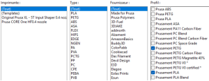 • Filaments : sélectionner uniquement les filaments utilisés à La Ruche ou dans votre laboratoire